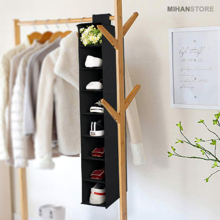 آویز کفش طبقاتی داخل کمد محصولی نوین و بسیار کاربردی است. این آویز به صورت قفسه ای همراه با گیره آویز چسبی جهت آویزان کردن داخل کمد و یا پشت درب می باشد. آویز کفش طبقاتی امکان استفاده از حداقل فضای ممکن برای نگهداری کیف وکفش های شما را فراهم می کند. فضای محفظه های نگهدارنده به گونه ای طراحی شده که علاوه بر کیف از آن می توان جهت نگهداری کفش نیز استفاده نمود و دارای هشت طبقه مجزا می باشد. از دیگر ویژگی های این آویز، جلوگیری از کثیف شدن، له شدن و خراب شدن کیف و کفش است. محصولی با طراحی جدید، ساده و در عین حال بسیار کاربردی که می تواند مشکل شما در نگهداری از کیف و کفش و لباس را برطرف کند.
