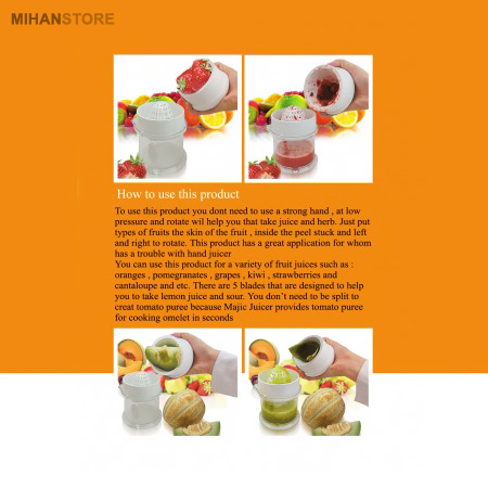 آبمیوه گیری جادویی Majic Juicer  یک وسیله پرکاربرد در فصل زمستان است. خوردن آب پرتقال و لیمو در فصل سرما باعث ایمن شدن بدن در برابر سرماخوردی می شود. اما گرفتن آب مرکبات دردسرهای خود را دارد ولی با آبمیوه گیری جادویی به راحتی هرچه بیشتر می توانید با چند حرکت ساده آب پرتقال، لیمو، کیو و ... را بگیرید. طرز استفاده از آبمیوه گیری جادویی Majic Juicer بسیار ساده است و هرکس در هر سنی می تواند از آن استفاده کند، چرا که برای این کار نیاز پنچه های قوی و بازوهای پرتوان نیست. فقط کافیست پرتقال ، لیمو یا هر میوه دیگر را از طرف پوست داخل پوست گیر قرار دهید و آن را روی پره های آبگیر بفشارید و با چرخش به سمت چپ و راست تا آخرین قطره آب میوه را خارج نمایید. گرفتن آب مرکبات بدون دخالت مستقیم دست از مهمترین عملکرد  Majic Juicerمی باشد. درپوش پوست گیر میوه برش خورده را آن چنان به پره های آب گیر می فشارد که تمامی آب میوه خارج می شود.