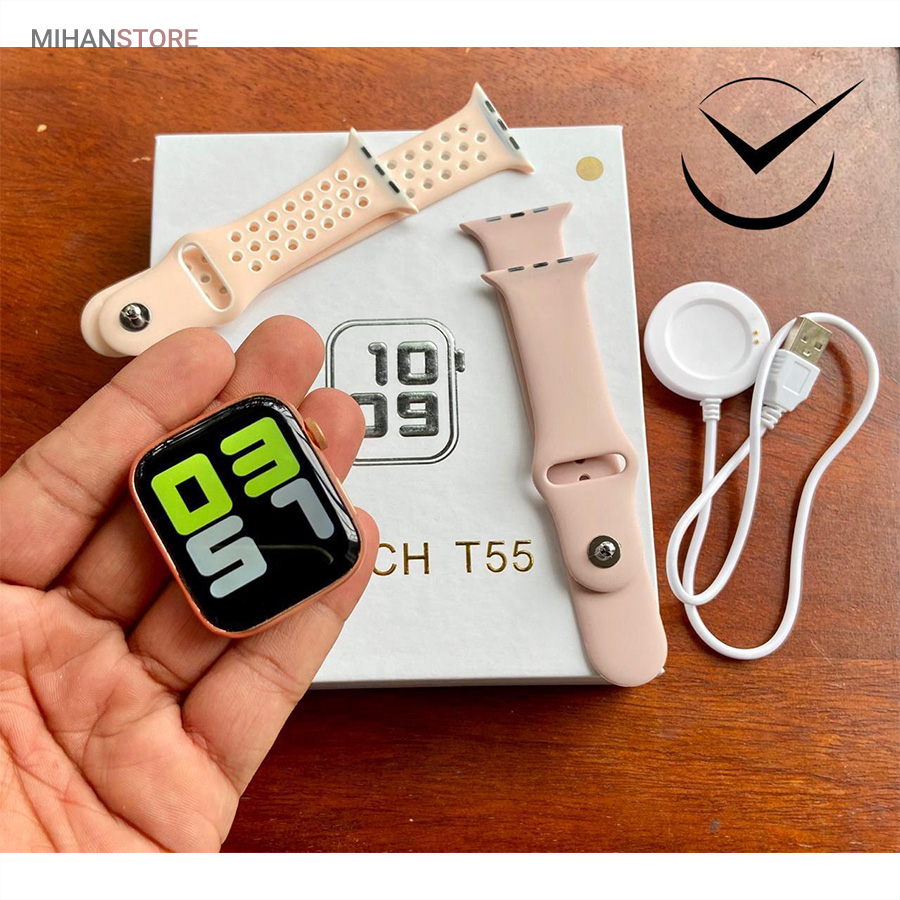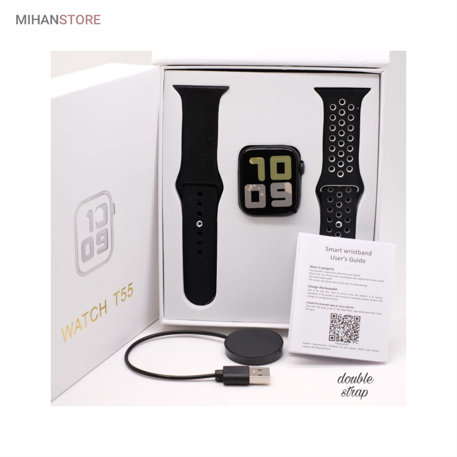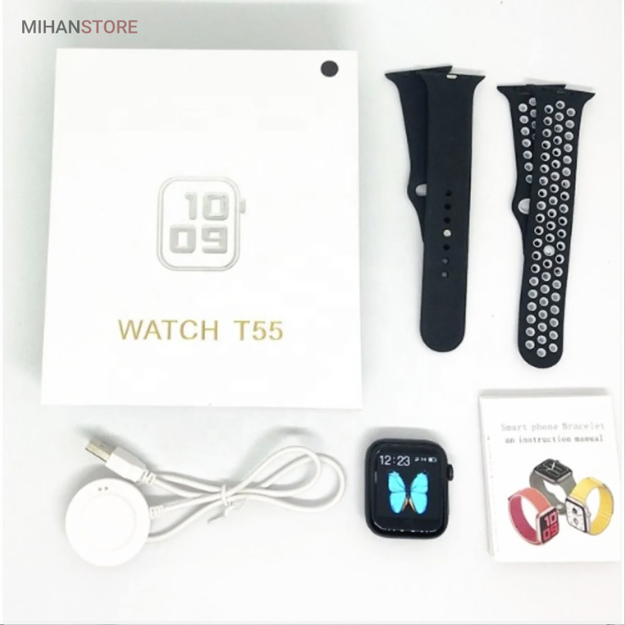 با صفحه نمایش 1.54 inch که برای آن تعبیه شده لذت ببرید.این ساعت کاملا لمسی میباشد که تمام صفحه نیست و حاشیه دارد.  از مزیت های قابل ذکر این محصول میتوانیم با قابلیت اتصال به بلوتوث جهت همسان سازی با گوشی اشاره کنیم،ساعت هوشمند مدل T55 با وجود دارا بودن حسگر شتاب سنج،قابلیت رد تماس،تنظیم هشدار روزانه،ژیروسکوپ و شمارنده ضربان قلب،تعیین اهداف ورزشی و..جذابیت ساعت را بیشتر کرده است.  همچنین این ساعت به تمامی دستگاه های اندرویدی وIos متصل خواهد شد،این گجت هوشمند توسط یک کابل مغناطیسی شارژ میشود.ساعت های هوشمندی که مشابه اپل واچ های شرکت اپل می باشد بسیار محبوب و پر فروش می باشند. ساعت هوشمند T55 با ظاهری مشابه واچ های اپل، با قیمت مناسب و امکاناتش حرفی برای گفتن پیدا کرده است. ساعت هوشمند T55 سبک، دارای وزن 32 گرم و با بند 42 گرم است.