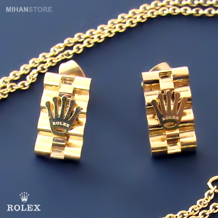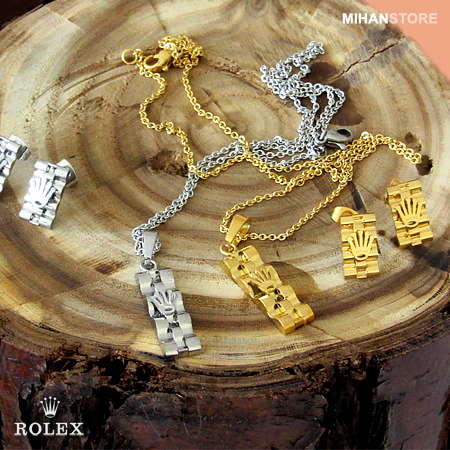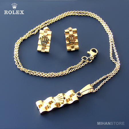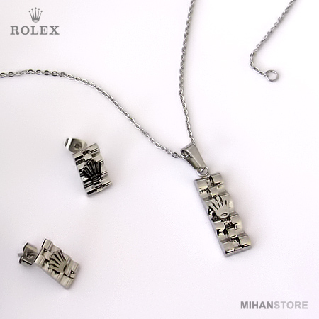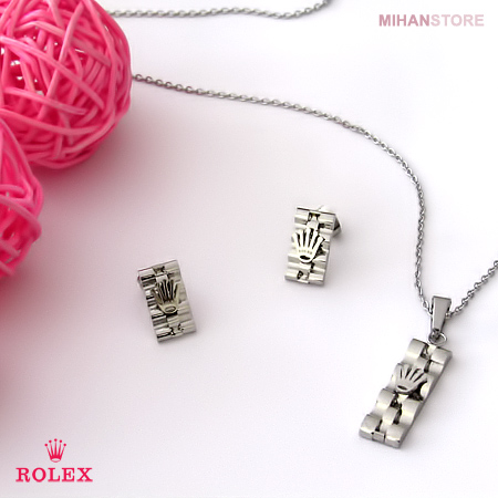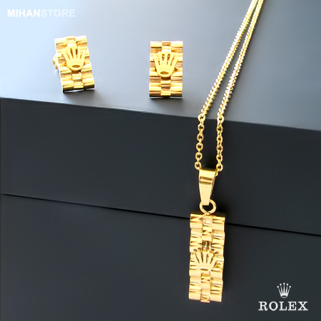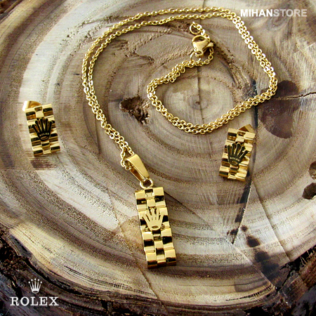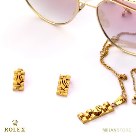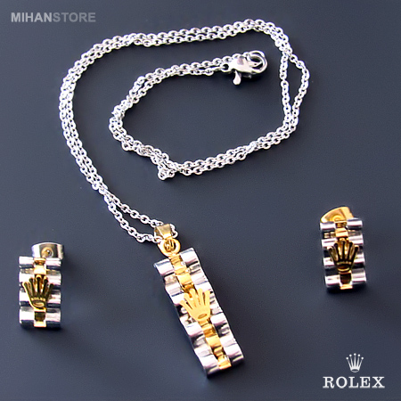این نیم ست فوق العاده زیبا دارای گردنبندی با پلاک مستطیلی شکل فوق العاده کلاسیک است و به زیبایی به گردن شما آویخته می شود. گوشواره های این نیم ست نیز مستطیلی بوده و بر روی آنها و همچنین پلاک گردنبند نماد فوق العاده شیک برند معروف رولکس نقش بسته است. شما می توانید این نیم ست را در رنگ های طلایی، نقره ای و ترکیبی از طلایی و نقره ای تهیه نمایید.
